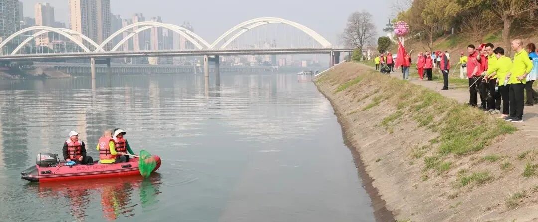 春风掠过新绿的树枝,碧水映衬蓝天,穿红马甲的党员志愿者、着天蓝校服的大学生、套文化衫的状元红水上救援队队员,在十里江岸线上连成流动的风景线。西湖桥上观景平台旁,状元红志愿服务联合会的周新建边擦汗边展示"战利品"--一个长达7米的废弃捕鱼网,“这个渔网沉在水底,不仅会缠住过往船只的螺旋桨,还可能困住游泳的人,非常危险。"他指着渔网上缠结的水草说道。