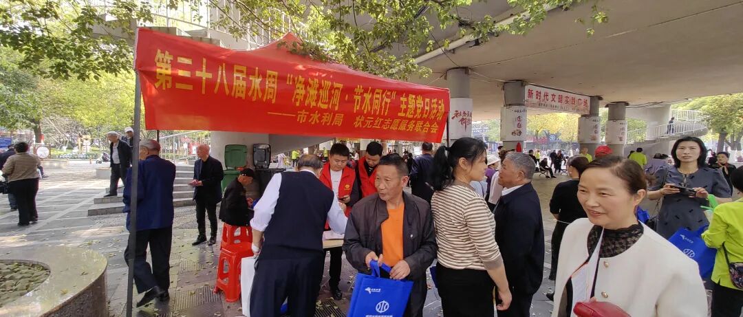 在西湖桥新时代文明实践广场上,市水利局开展的“净滩巡河 节水同行”主题党日活动宣讲台前人头攒动,党员罗运帧声音洪亮:"洗菜的水留着冲厕所,一年能省好几吨!"他指着《长江保护法》宣传册上面的漫画,“‘一水多用’——淘米水浇花,洗衣水拖地,简单又实用。”拎着环保购物袋的居民们三三两两的讨论着:"马桶水箱里放个矿泉水瓶,每次都能省水","空调冷凝水能拖地、擦玻璃",“看来以后洗澡的改‘马拉松’习惯了”,王大爷认真地说上一句,引得周围一片笑声......罗运帧擦擦汗笑道:"对,节水就得这样互传经验,口口相传!"。