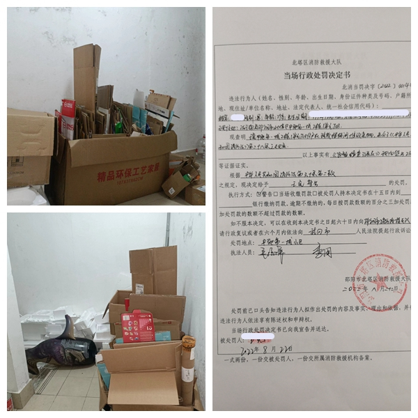 8月22日,北塔区消防救援大队在中驰第一城进行疏散通道专项检查时,对某住户在楼梯间堆放杂物的行为进行了当场处罚。