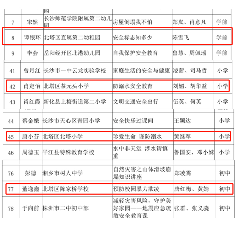其中经过层层评比,区直属第二幼稚园教师谭银环的作品《安全标志知多少》、茶元头小学教师肖定怡的作品《防溺水安全教育》、北塔小学教师唐小芬的作品《珍爱生命 谨防溺水》、陈家桥学校教师董逸鑫的作品《预防校园暴力欺凌》均获得本次安全教育教学竞赛三等奖。