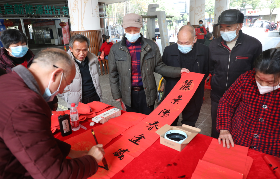 “大师,麻烦帮我写一副春回大地的对联”,现场群众围得水泄不通,情绪高涨,纷纷拿着春联纸张,请求书法家书写春联。3名老书法家现场挥毫泼墨,根据市民对内容、字体不同的需求书写春联,书法家们铺纸、蘸墨、运笔,一气呵成,把美好的祝福抒发在鲜艳的红纸上,随着毛笔不时舞动,充满喜气的春联跃然纸上,现场群众叫好声不断。