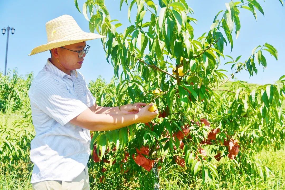 去年7月,吕俊龙在黄桃种植基地观察黄桃生长情况