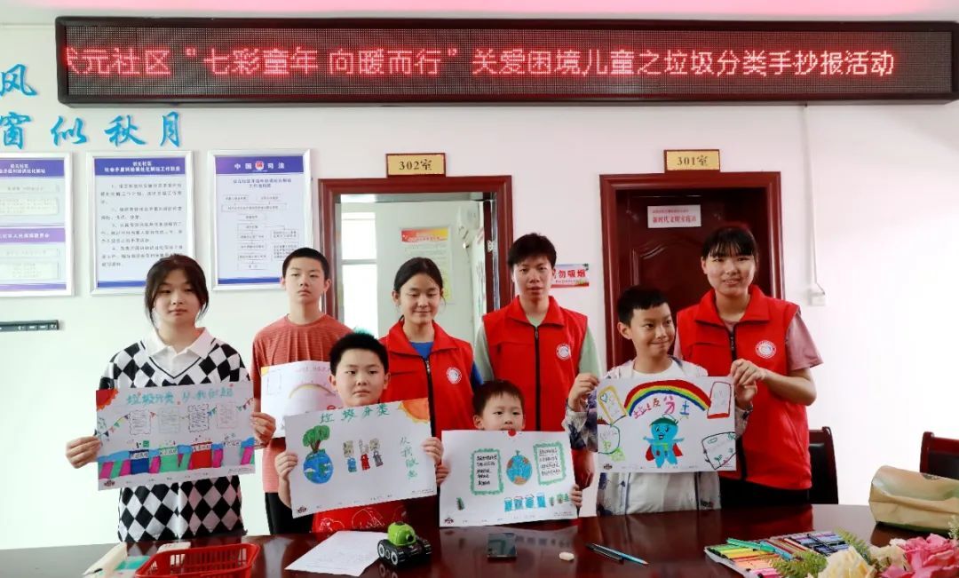垃圾分一分,环境美十分。当垃圾分类成为一种新时尚,我们不能忘记还有这样一群孩子--困境儿童,他们也将与时俱进,学习文明新风尚。5月21日上午,状红志愿服务联合会的大学生志愿者走进状元社区,开展“七彩童年 向暖而行”关爱困境儿童之“垃圾分类手抄报”绘画活动,5名孩子在监护人的陪伴下参加活动。